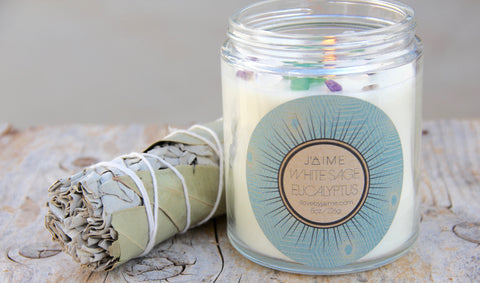6oz. Soy wax infused with oils of White sage, eucalyptus, lavender, quartz, amethyst, rose quartz and J'AIME's mysterious musk. Burns for up to 24 hours.